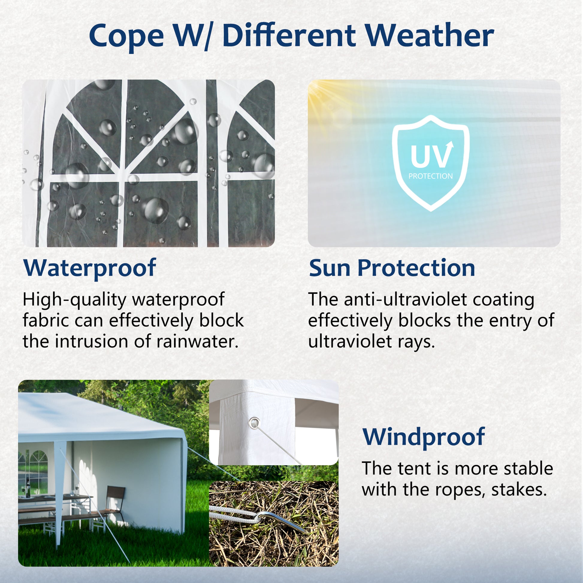 Large Inner Space: Our 10' x 30'outdoor tent has spacious inner space for you and your friends to have activities. It can hold many people for dining, party or wedding together. Regardless of rain or sunshine, it will probably not affect outdoor activities if you have such a canopy. What's more, the canopy can also be a temporary garage for your car, tools, patio furniture.
