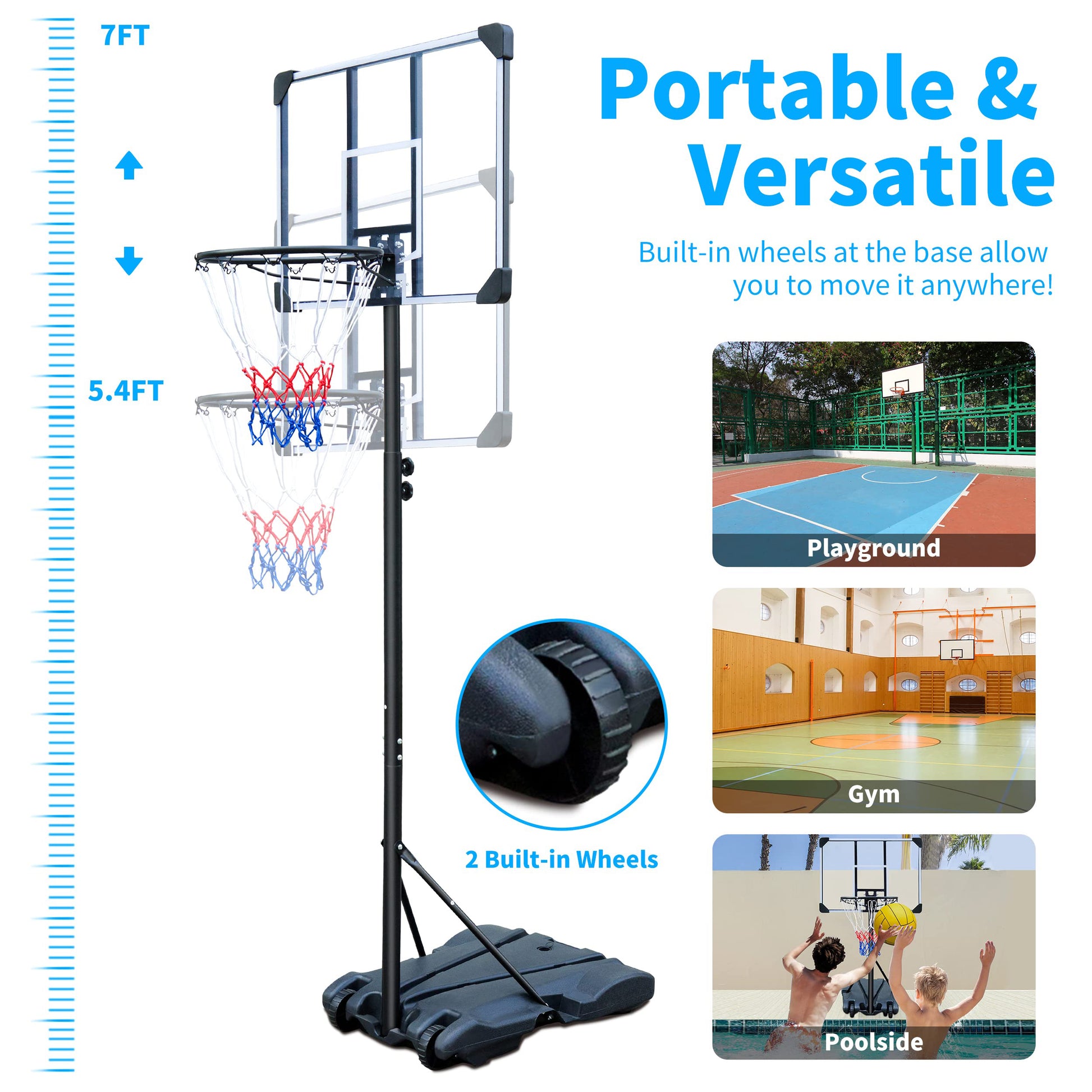 Height-adjustable basketball hoop: The height of the basketball hoop can be adjusted from 5.4 ft to 7 ft, suitable for boys and girls of different ages to practice basketball. This products can also be used as swimming poor basketball hoop, suitable for adults and kids.